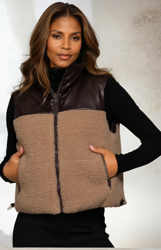 Tashena Reversible Faux Leather-Sherpa Contrast Bubble Crop Vest