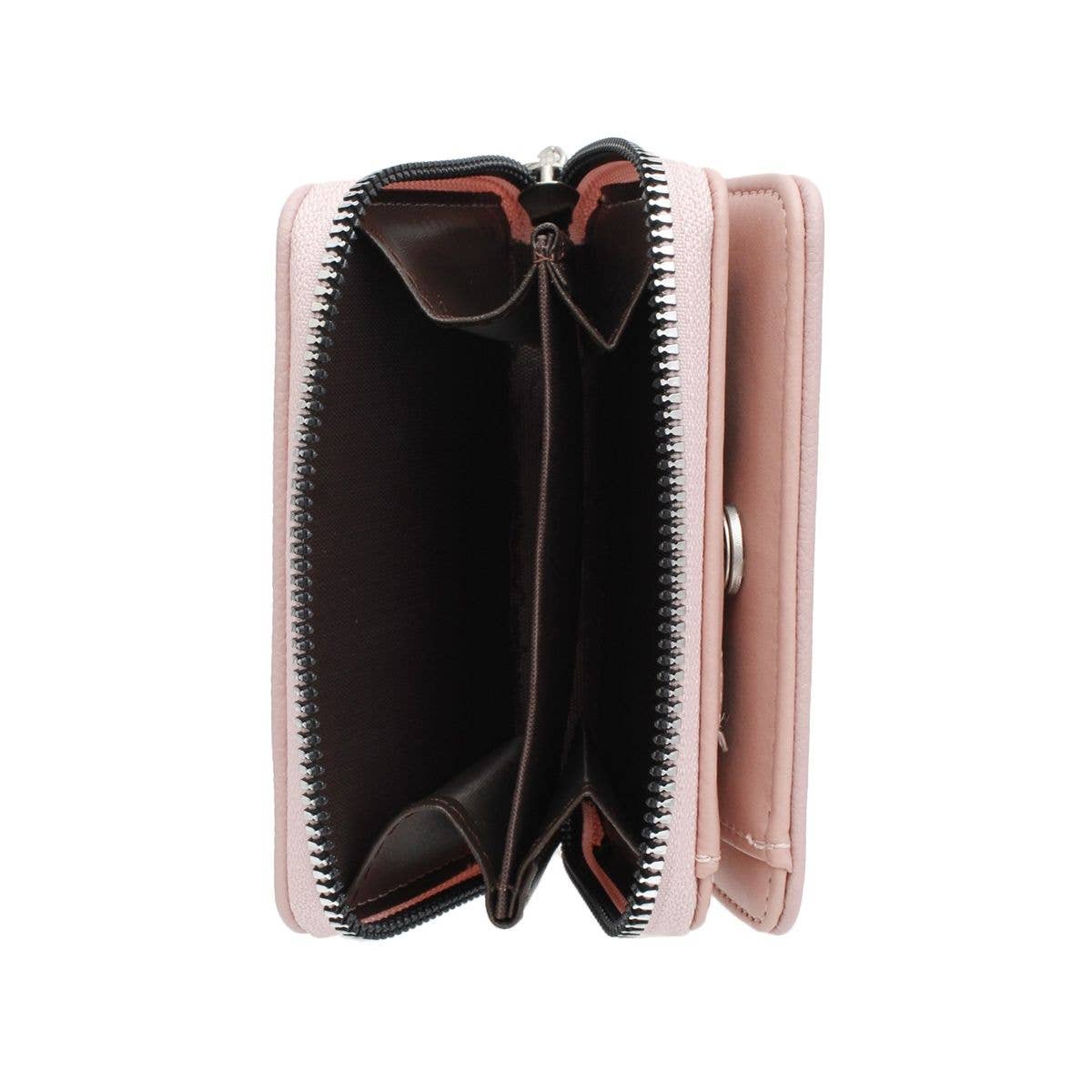 Alpha Kappa Alpha Sorority Paraphernalia Women's Keychain Zipper Wallet. Pink Soft Vegan Faux Leather Snap and Zipper Wallet Featuring Green AKA Greek Letter Paint Stamp Detail. Wallet Specs: Magnetic Snap Closure Front Compartment with ID Window Slot, Credit Card Slots, and Cash Pocket. Silver Metal Zipper Closure Compartment with Divided Interior. Zipper Features Silver Metal Keyring with Faux Leather Tassel Measuring 4.25" Long Plus Pink and Green 1908 Ivy Leaf Charm Measuring 1.5".