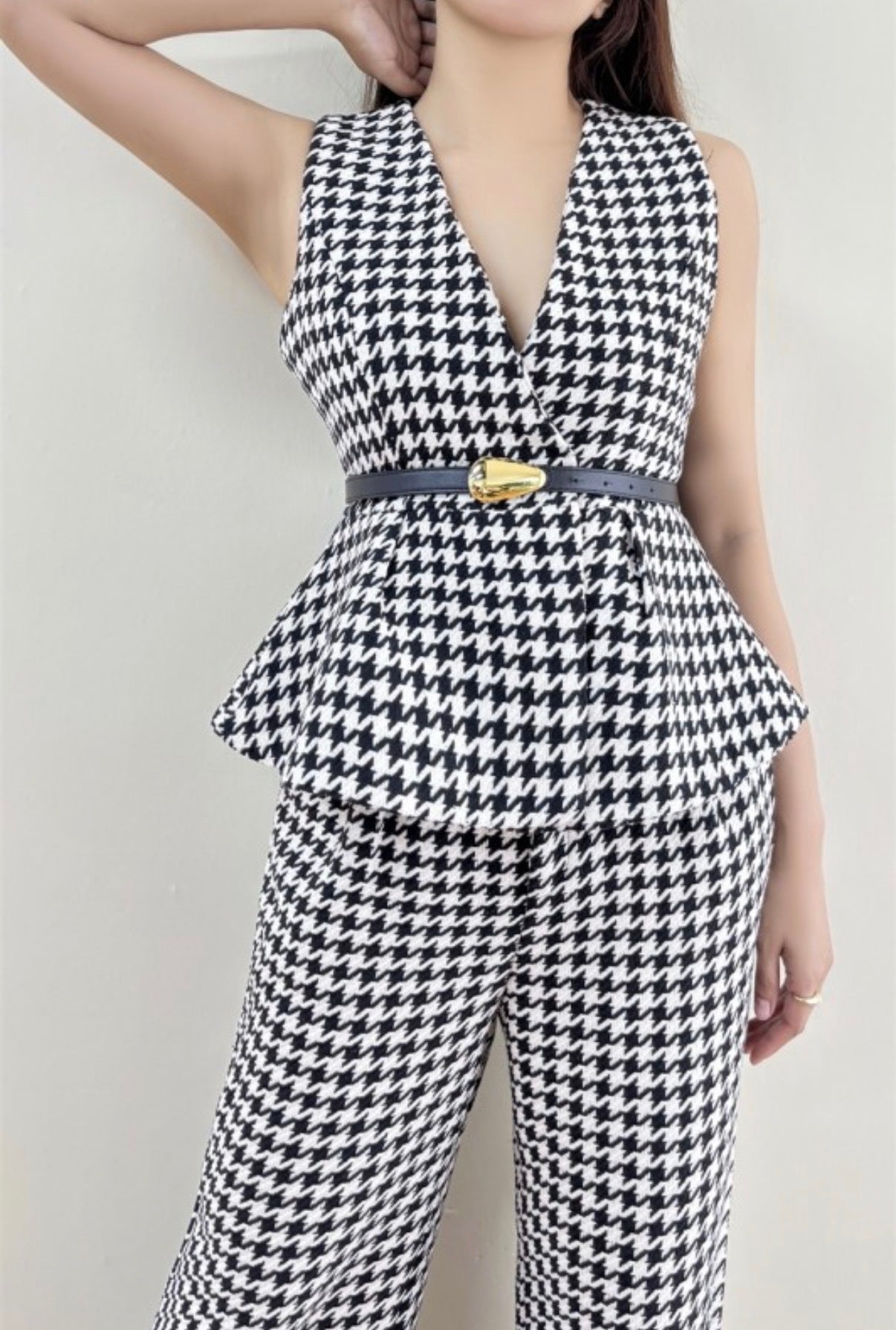 Classic and sophisticated hounds tooth print. Timeless style that always delivers. Perfect wide-leg pants with a button closure and a stretchy waist for a comfortable, cinched-in fit. fully lines with snap button closure. Figure flatting and trendy. Pairs perfectly with the matching Peplum La Rosa top.