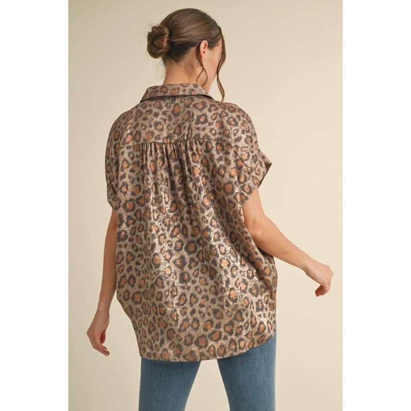 - Leopard Print Collared Button Up Top - Leopard print collared button up top with cuffed short sleeves and ruched shoulders. - Non-sheer, lightweight. - Model is 5'10'' and is wearing a Small.