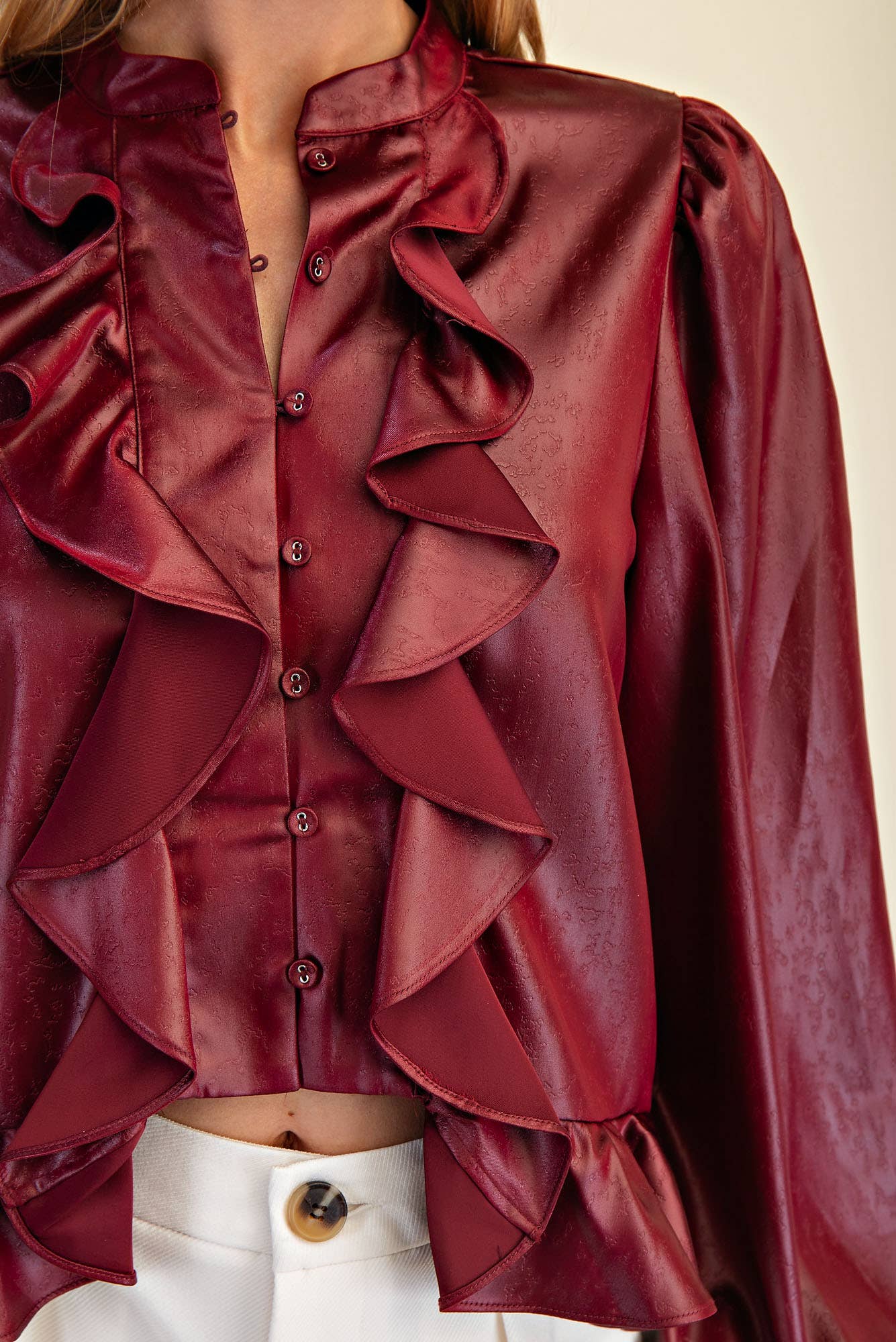 Introducing the exquisite Long Sleeve Ruffle Top, crafted from a luxurious vegan poly-coated fabric. This stunning piece showcases elegant ruffle details cascading down the front and gracefully lining the hem, making it a standout addition to any wardrobe.