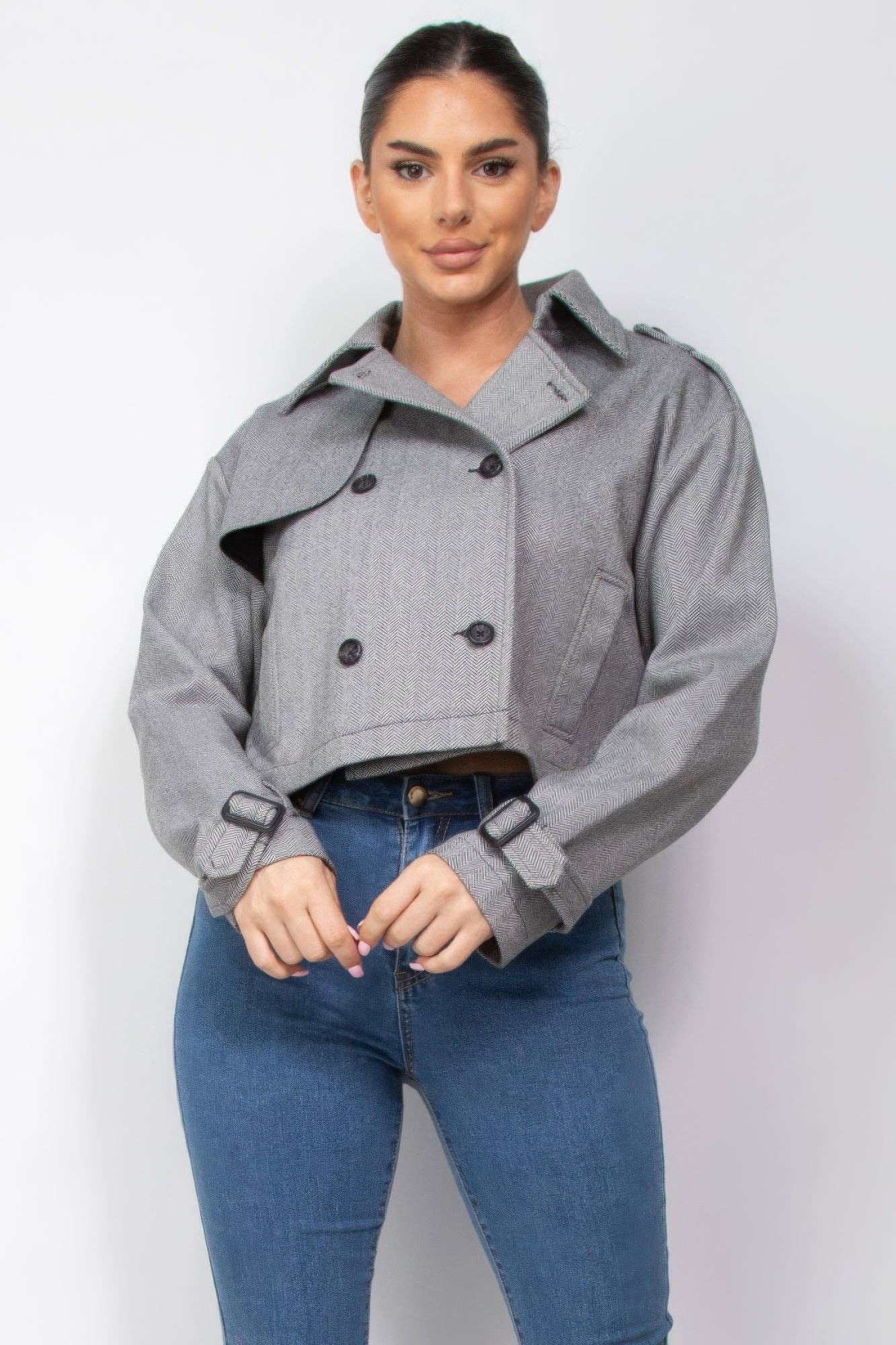 Elevate your wardrobe with our Notch Buckled Sleeve Crop Trench Coat, a timeless addition that seamlessly blends classic style with leisure comfort.