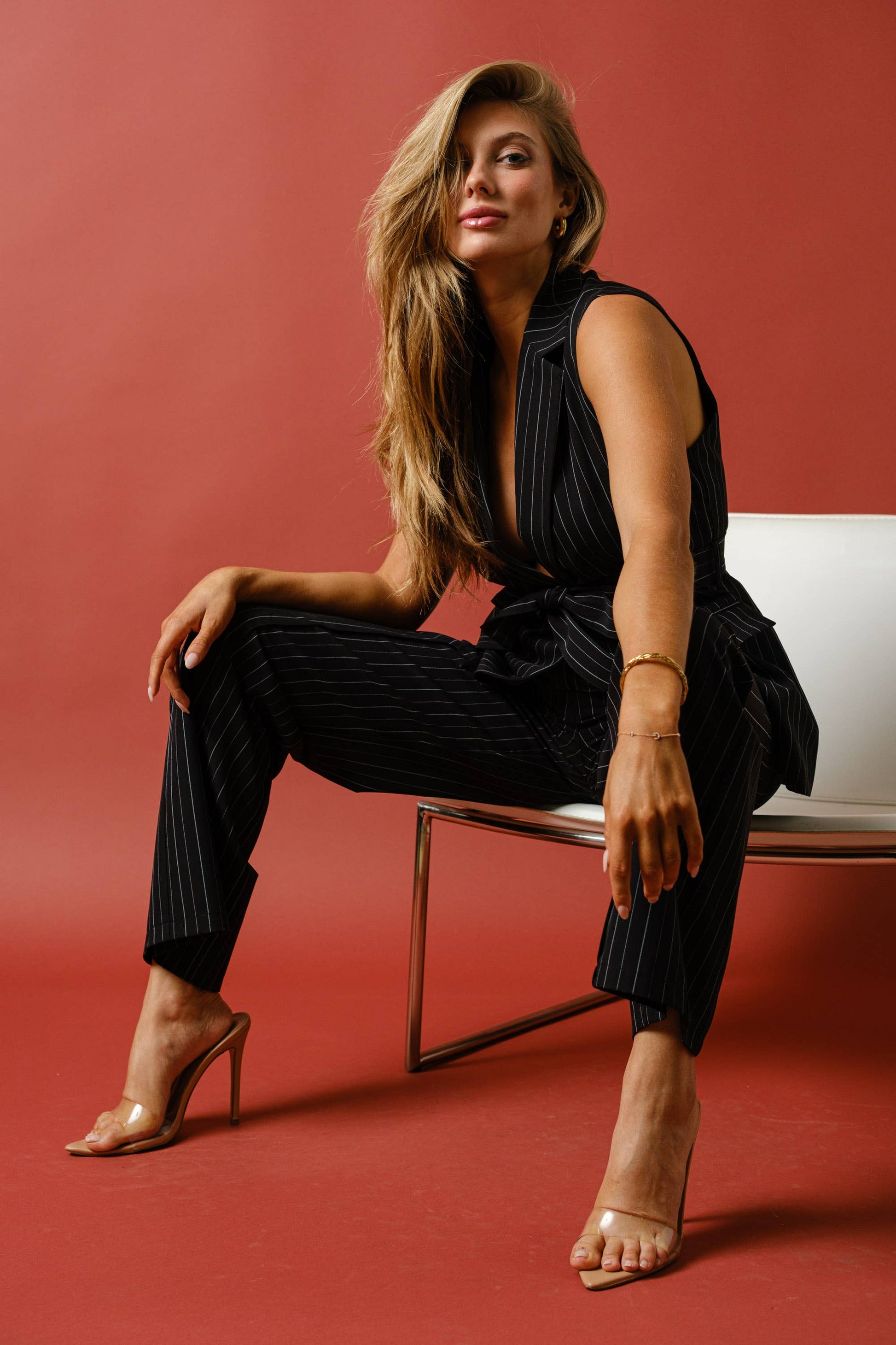 Pinstripes blazer vest suit set with sash