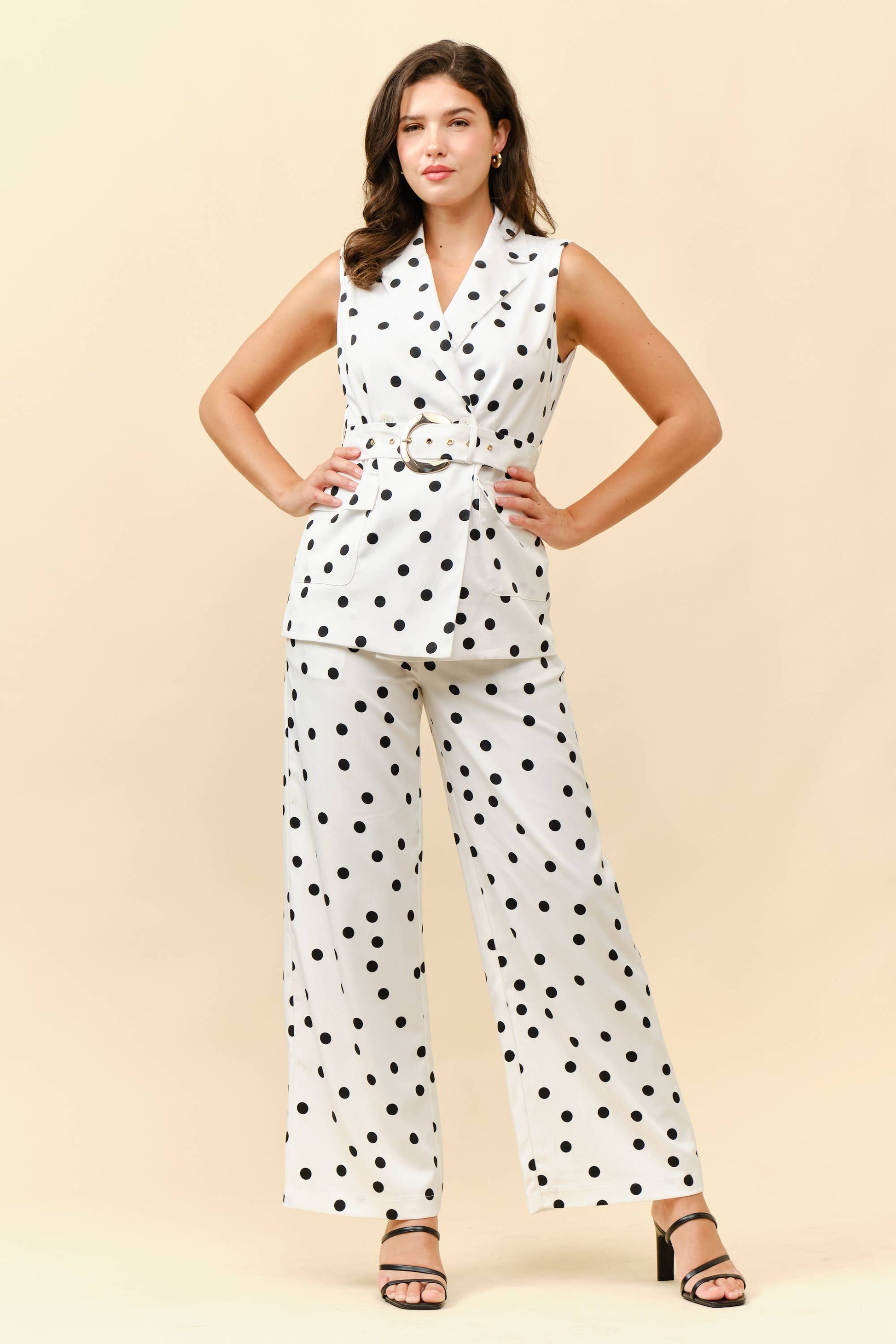 Polka dot belted vest and pants 2-piece set. The top and bottom are lined with a breathable, comfortable fabric.